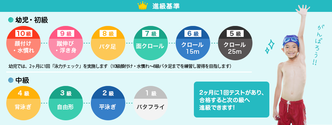顔付けの練習からクロール25m習得まで、水泳の基礎を学びます。
