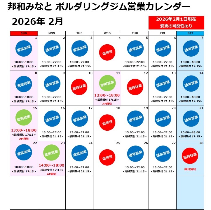 ボルダリングジム2026年3月2月営業のお知らせ
